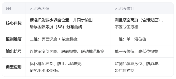 污泥界面儀與污泥液位計(jì)雖同屬污水處理中的監(jiān)測(cè)設(shè)備,但其功能定位、工作原理與應(yīng)用場(chǎng)景存在本質(zhì)差異。以下為系統(tǒng)性詳細(xì)說(shuō)明: